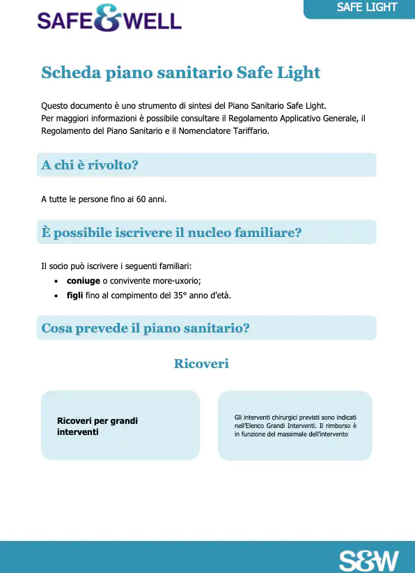 Safe & Well – professionisti della mutualità sanitaria che individuano la tutela ideale per te: piani sanitari flessibili (Safe Light, Active, Serenity, Premium), rendita Long Term Care, tutela del reddito con Tutela Lavoro, welfare aziendale e assistenza medico-digitale 24/7.